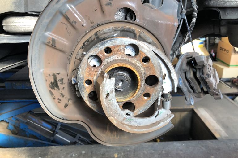 リアのブレーキ廻りを分解して、サイドブレーキのワイヤーを外します。