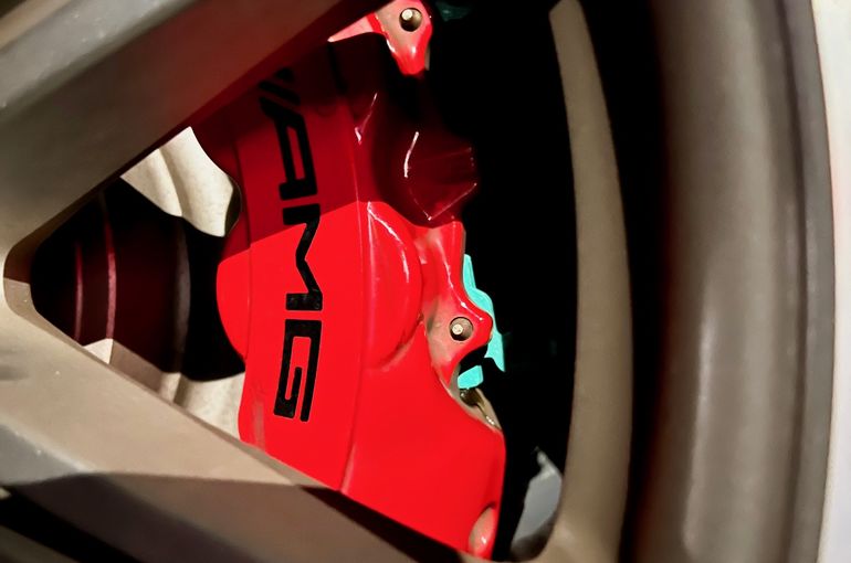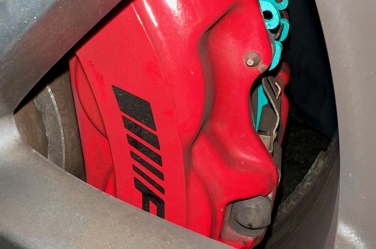 赤いAMGのビッグキャリパーから覗くプロジェクト・ミューのイメージカラーの